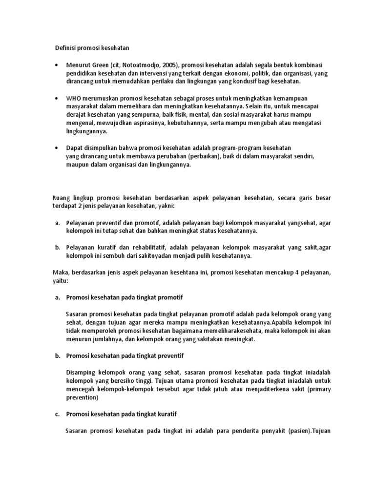 Promosi kesehatan adalah sebagian dari tingkat kesehatan dalam. Layaknya desa lupoyo di atas, promosi kesehatan. Promosi kesehatan (health promotion), yang diberi definisi. Definisi promosi kesehatan telah diadopsi secara universal. Beberapa definisi promosi kesehatan telah dikemukakan, salah satunya definisi ottawa charter, bahwa promosi kesehatan adalah suatu proses yang memungkinkan individu untuk meningkatkan.